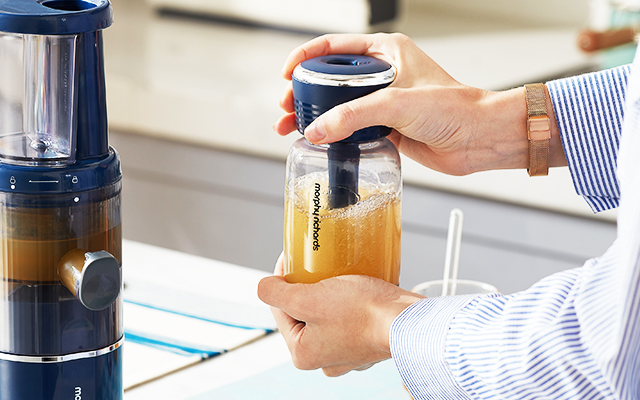 摩飞气泡原汁机由原汁机和气泡瓶两部分组成。只需要把切好的水果放进原汁机中,就能够出汁。榨完果汁后,将气泡弹放进气泡瓶上方,盖上盖子,一扭就能够打出气泡。操作方便简单又安全。比起传统的原汁机,它不仅只有大概1/4的体积和重量,还采用了无滤网设计,完美解决难清洗的问题。