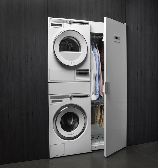 其中,与洗衣机完美搭配的ASKO干衣机,同样延续了品牌的创新基因——采用蝶形烘干系统,在烘干过程中能让衣物均匀受热,同时有效避免衣物缠绕打结,确保每一件衣物都能快速、彻底地干燥,且烘干后不易起皱,省去了后续熨烫的麻烦。而干衣柜与隐藏助手的加入,则进一步丰富了洗衣房的功能:干衣柜可用于衣物的日常晾晒与护理,隐藏助手则能收纳洗衣用品,让整个洗衣空间保持整洁有序。