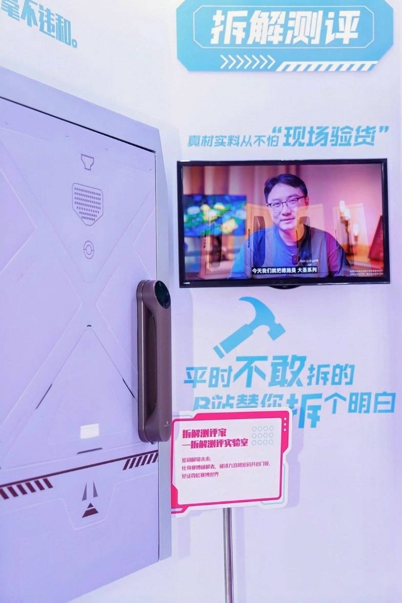 而在另一侧主打“智未来科技测评”的区域,麒麟R9则呈现出截然不同的硬核气质。巨大的赛博朋克风格门体模型上,印有极具未来感的几何线条,旁边醒目的标语“即使放在赛博街头也毫不违和”,精准传达了麒麟R9的高定隐形设计理念。旁边的屏幕滚动播放着电池拆解与电机结构的透视图,配合墙面上“平时不敢拆的,B站替你拆个明白”的趣味文案,直接呼应了年轻群体最喜爱的“硬核拆解”文化。这种“真材实料不怕看”的展示方式,极大地增强了年轻消费者对德施曼产品品质的信任感。