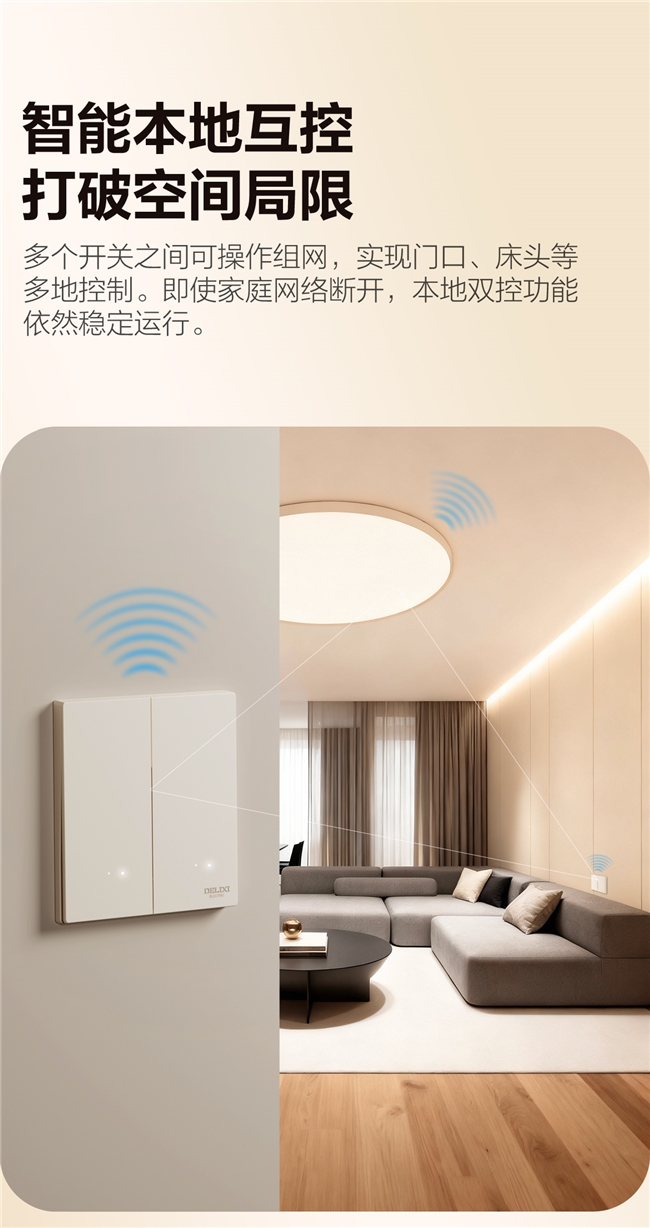 本地互控:即便断网,开关间仍可实现跨区域双控与多控;